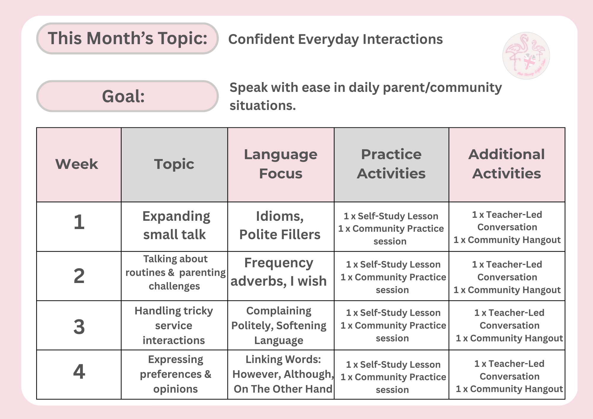 Based on the community curriculum, you will have a clear topic every week with a different language focus, from making small talk at parties to booking appointments, sharing your plans, or telling your story. -